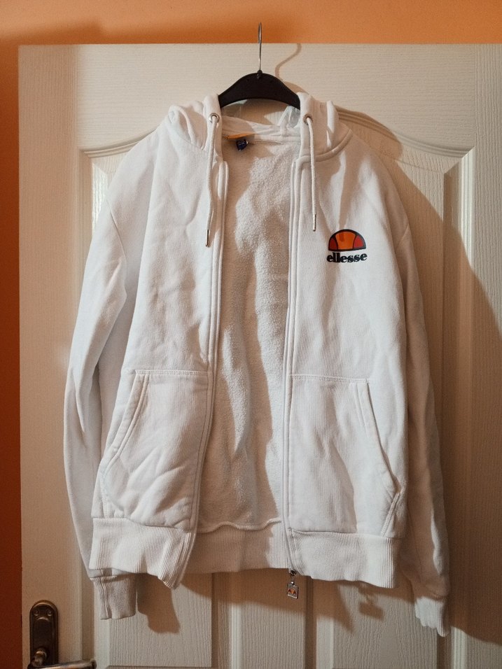 Beyaz renkli, fermuarlı ve crew yaka kadın kapşonlu hırka. Uzun kollu, bol kesim ve yumuşak, sıcak kumaştan üretilmiştir. Ellessee baskılıdır, rahat sokak stili için uygundur. Çok az kullanıldı sorunu yoktur. Boyu 65cm, iki kol arası ölçüsü 52cm. Bedeni XS yazıyor ama L bedene kadar olur. Zara marka degildir. Satın aldıktan sonra lütfen iade talebinde bulunmayınız.