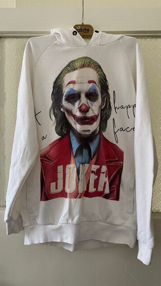 Beyaz pamuklu sweatshirt, kapüşonlu ve bol kesimdir. Uzun, kabarık kollu ve önünde "JOKEA" yazılı koyu renkli Joker baskısı bulunur. Günlük kullanım için uygundur.