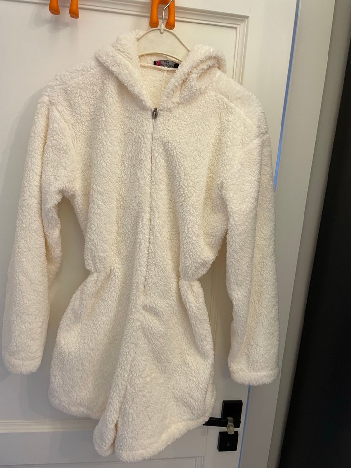 Beyaz Kapüşonlu Kadın Midi peluş tulum
