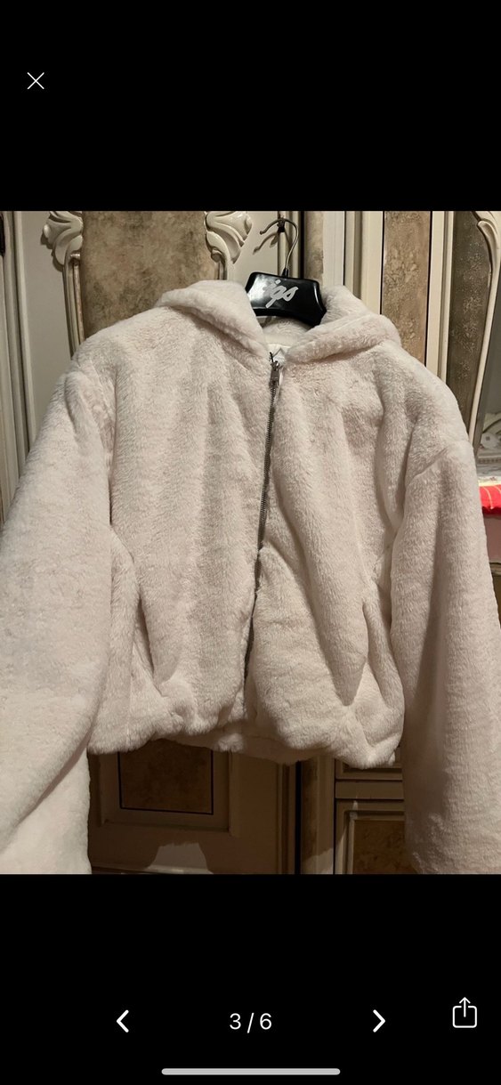 Beyaz kapüşonlu ceket, yumuşak ve sıcak peluş kumaş, uzun kollu ve vücuda oturan kesimle rahat sokak stili için uygundur.