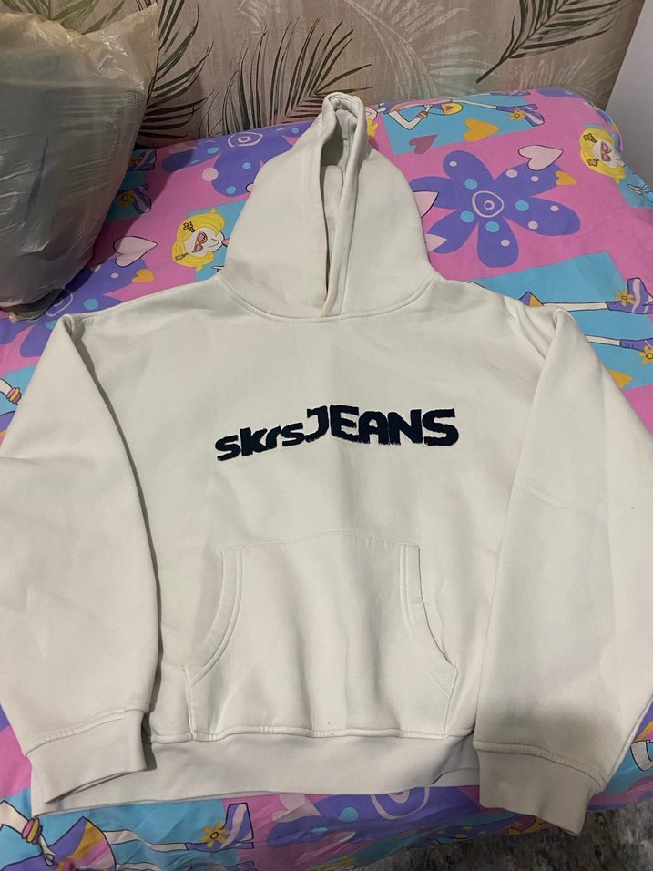 Yumuşak kürk dokulu, uzun kollu, kapüşonlu ve baskılı logolu bol kesim beyaz sweatshirt, fermuarlı cep detaylı.