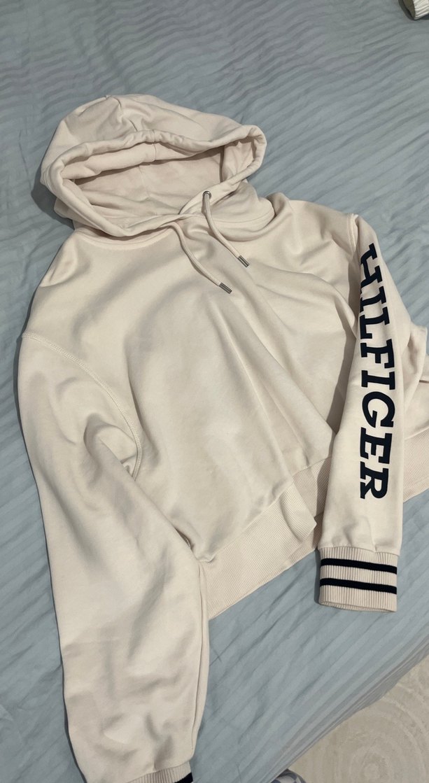 Uzun kollu, kapüşonlu ve bol kesim beyaz kadın sweatshirt. Pastel tonlarda, kolunda 'HILFIGER' baskısı bulunur. Yumuşak ve sıcak kumaştan günlük kullanım için uygundur.