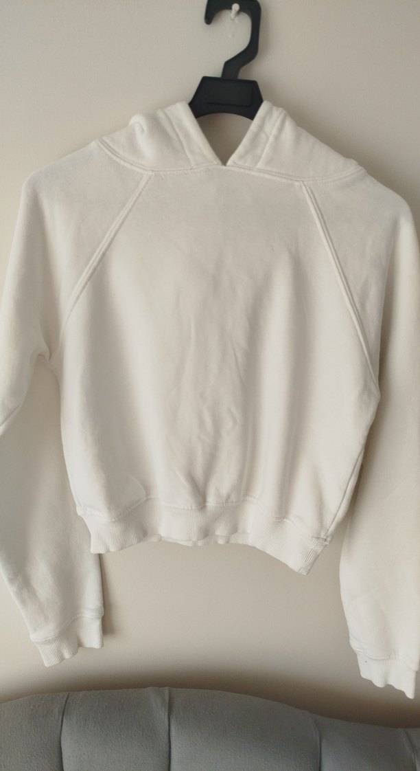 Pamuklu, kapüşonlu ve uzun kollu beyaz sweatshirt. Bol kesimi ve günlük rahatlığıyla sokak stiline uygun.