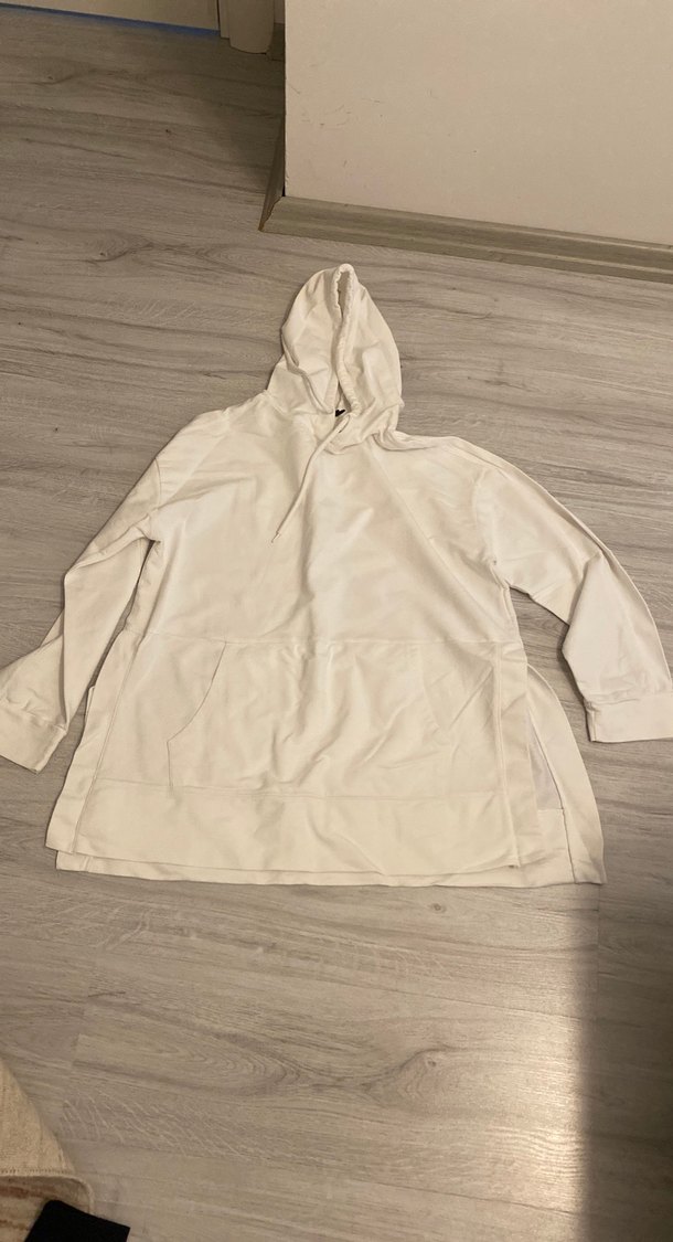 Beyaz kapüşonlu, uzun kollu, rahat kesim kadın sweatshirtü. Yumuşak keten kumaştan, günlük sokak ve spor tarzına uygun sade tasarım. 65 cm