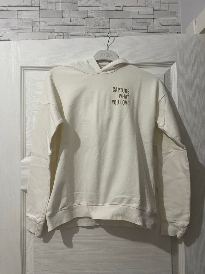 Pamuklu, beyaz, uzun kollu ve kapüşonlu kadın sweatshirtü. Bol kesim ve "CAPTURE WHAT YOU LOVE" yazılı baskıyla rahat bir sokak tarzı sağlar. Günlük kullanım için uygun.
