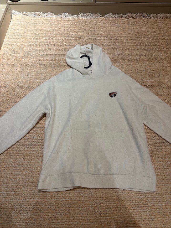 Uzun kollu, kapüşonlu ve baskılı detaylı beyaz kadın sweatshirtü. Yumuşak kumaştan, rahat kesim ve günlük kullanım için cepli.