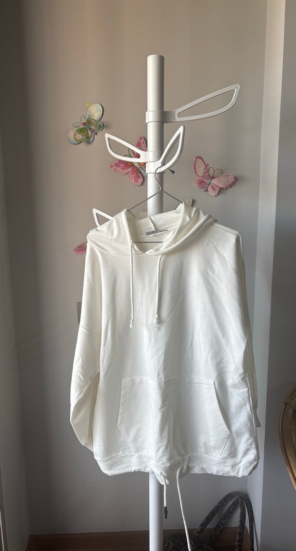 Oversize. Beyaz kapüşonlu, uzun kollu ve bol kesim kadın sweatshirt. Yumuşak pamuktan yapılmış, günlük kullanım için rahat ve sade bir tasarıma sahip. Midi uzunlukta ve şık bir duruş sunar.