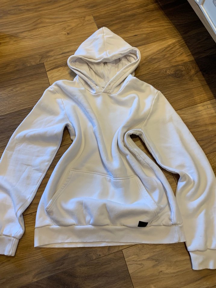 Beyaz kapüşonlu sweatshirt, uzun kollu ve bol kesimdir. Yumuşak ve sıcak kumaştan üretilmiştir. Günlük athleisure ve streetwear tarzına uygundur. ️