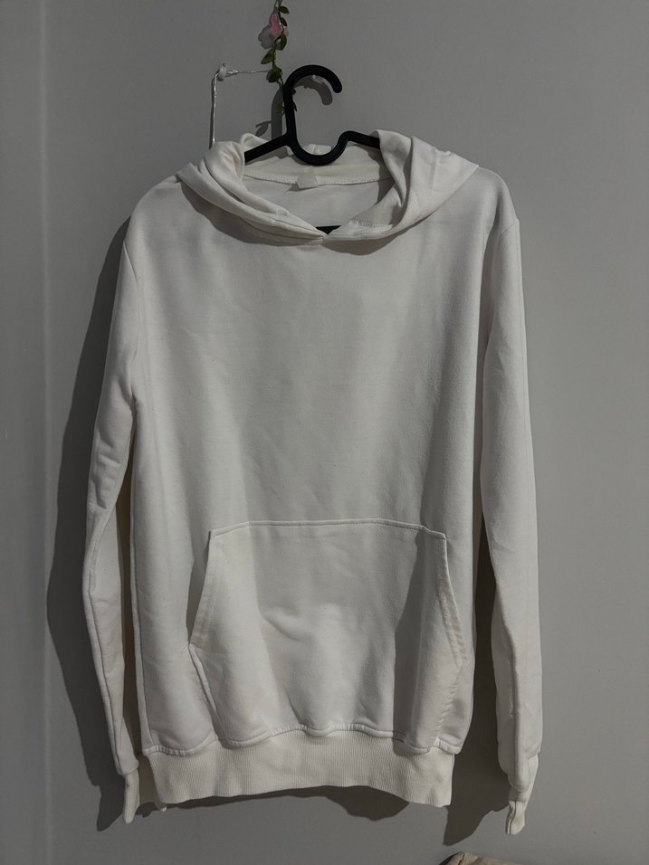 Beyaz, kapüşonlu kadın sweatshirt, uzun kollu ve bol kesimdir. Yumuşak, sıcak kumaştan üretilmiş, ön ceplidir. Minimalist ve gündelik stil için uygundur. Hediye idi kullanmıyorum büyük geliyor oversize