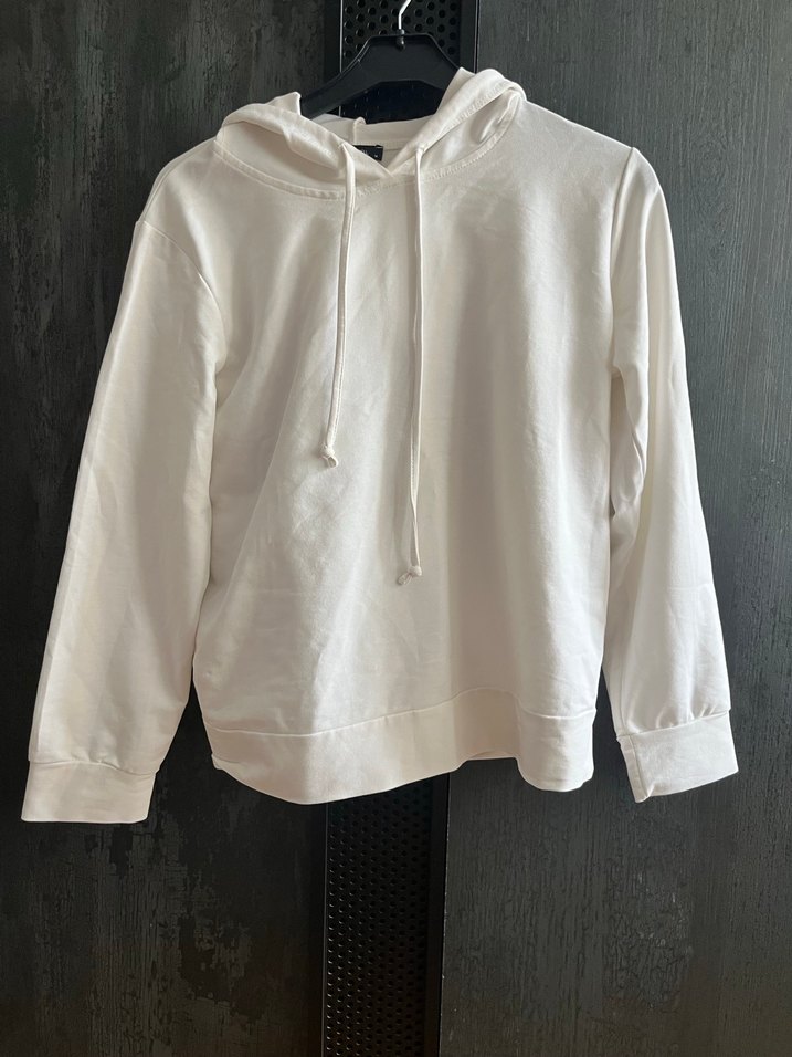 Beyaz kapüşonlu, uzun kollu kadın sweatshirtü. günlük rahat kullanım için uygun, sokak tarzı etkisiyle.