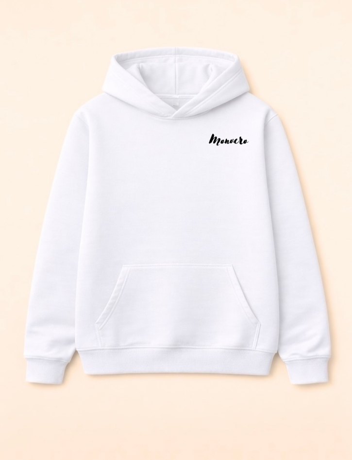 Beyaz renkte, kapüşonlu ve uzun kollu kadın sweatshirtü. Yumuşak kumaştan, baskılı detaylı ve kanguru cepli, rahat kesim. Günlük kullanım için minimalist tarzda. HER BEDENİ MEVCUTTUR UNISEX