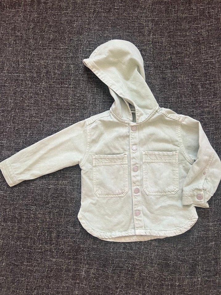 Beyaz keten kumaştan, kapüşonlu ve düğmeli, bol kesim kız çocuk ceketi. Düz ve desen içermeyen sokak stili için uygundur.