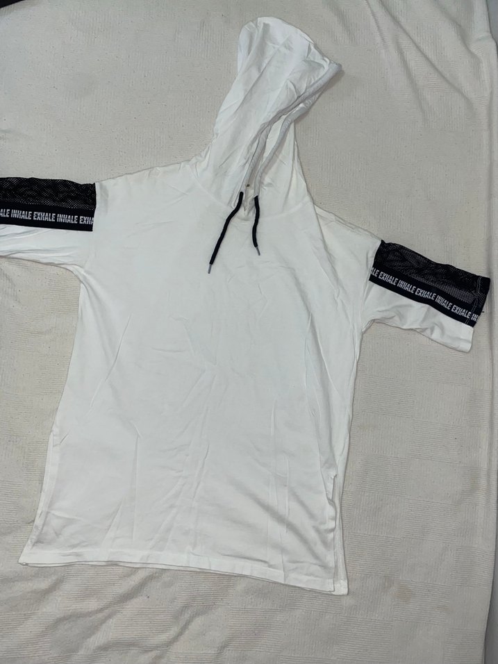 Beyaz kapüşonlu kısa kollu sweatshirt, kollarındaki file detaylarıyla. Hiçbir kusuru yoktur.
