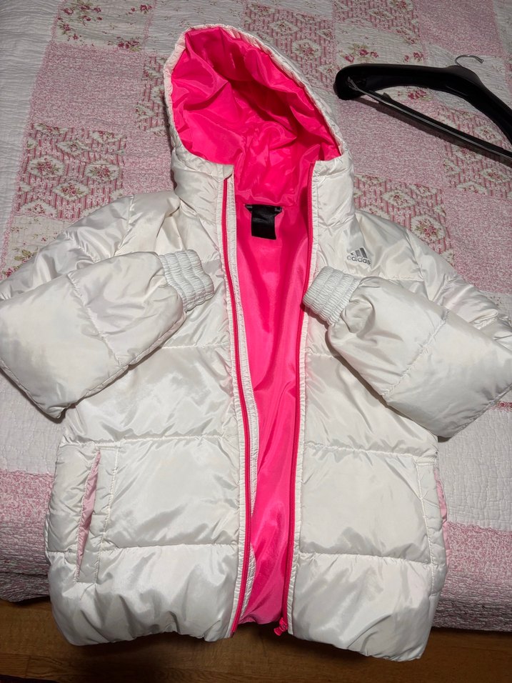 Bu beyaz kışlık mont, fermuarlı ve canlı pembe iç astarlı. Uzun kollu, fitted kesim ve günlük sokak stili için uygun. Orta uzunlukta ve rahat bir yapıda. ❄️Hasarı bulunmamaktadır.
