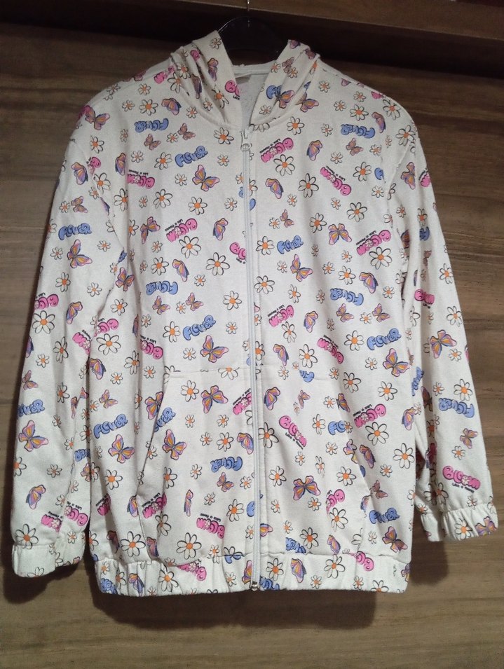 Yumuşak beyaz kumaş üzerine renkli baskılarla tasarlanmış, kapüşonlu ve fermuarlı bol kesim kız çocuk sweatshirt