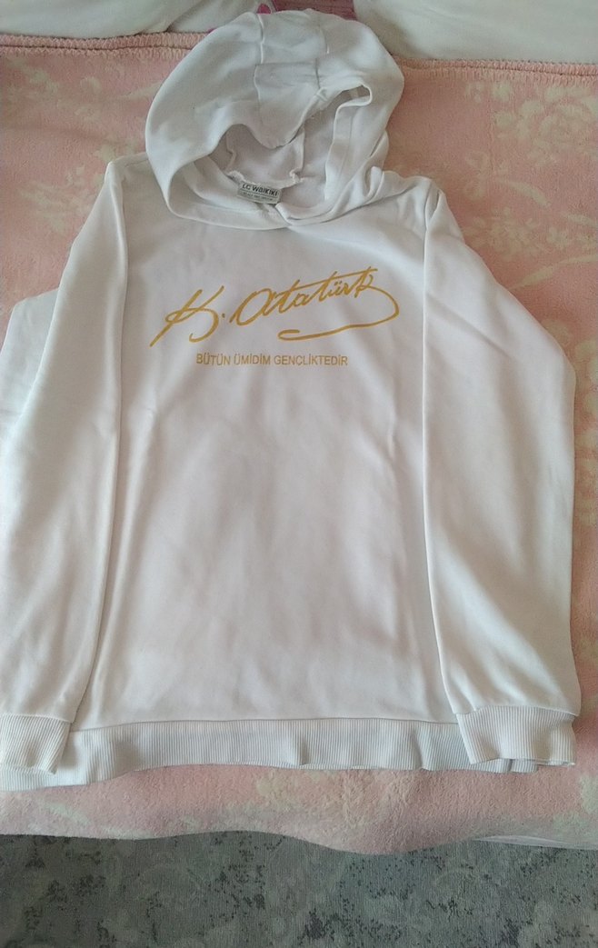 Beyaz kapüşonlu sweatshirt, uzun kollu ve bol kesimdir. Yumuşak sentetik kumaştan üretilmiş, "K. Atatürk Bütün Ümidim Gençliktedir" yazılı baskıya sahiptir. Günlük kullanım için uygundur.