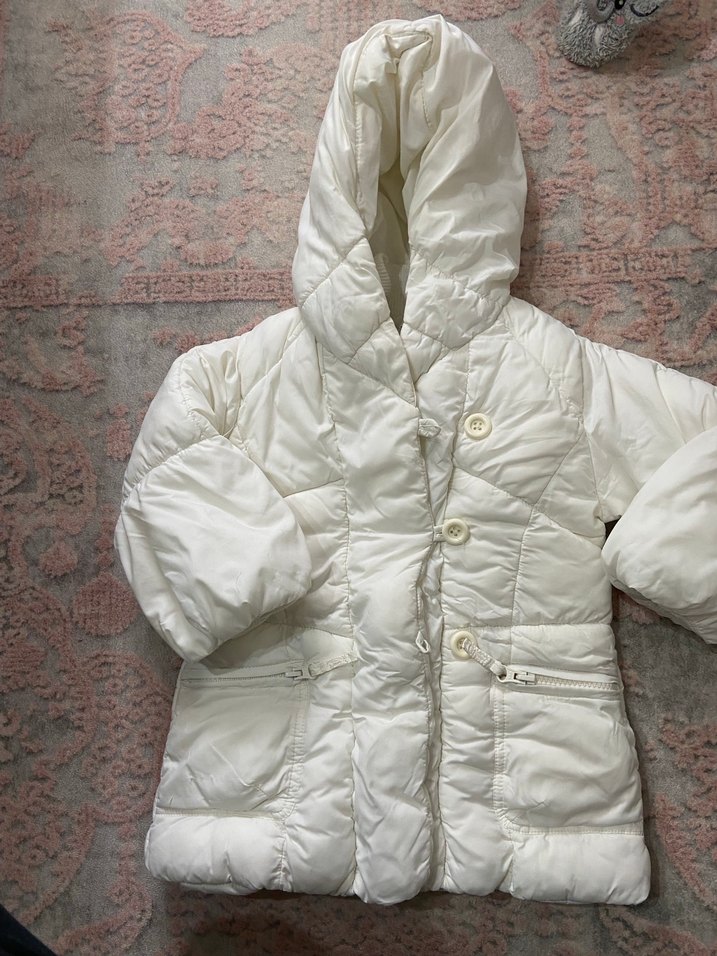 Beyaz, kapüşonlu ve düğmeli kız montu. Notlu yaka, fermuarlı cepler ve yumuşak, sıcak kumaşla sokak tarzına uygun. ❄️