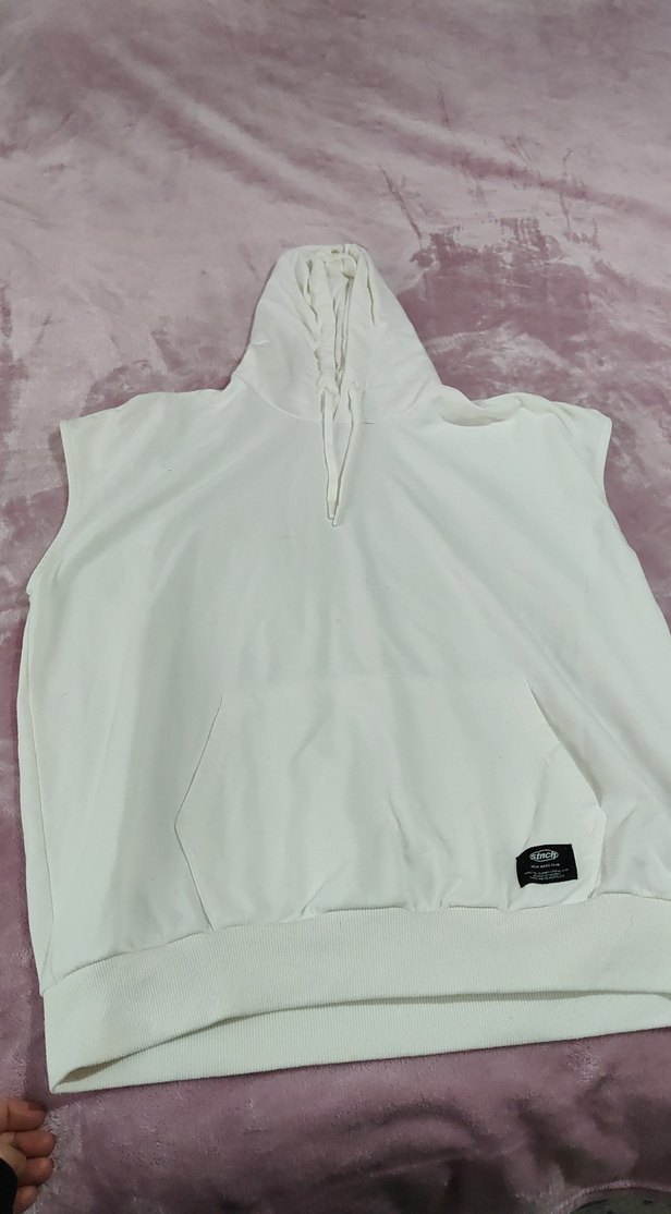 Beyaz kapüşonlu kolsuz sweatshirt, yumuşak ve sıcak kumaştan, rahat bol kesim ve normal midi boyda, ön cep detaylıdır. ️