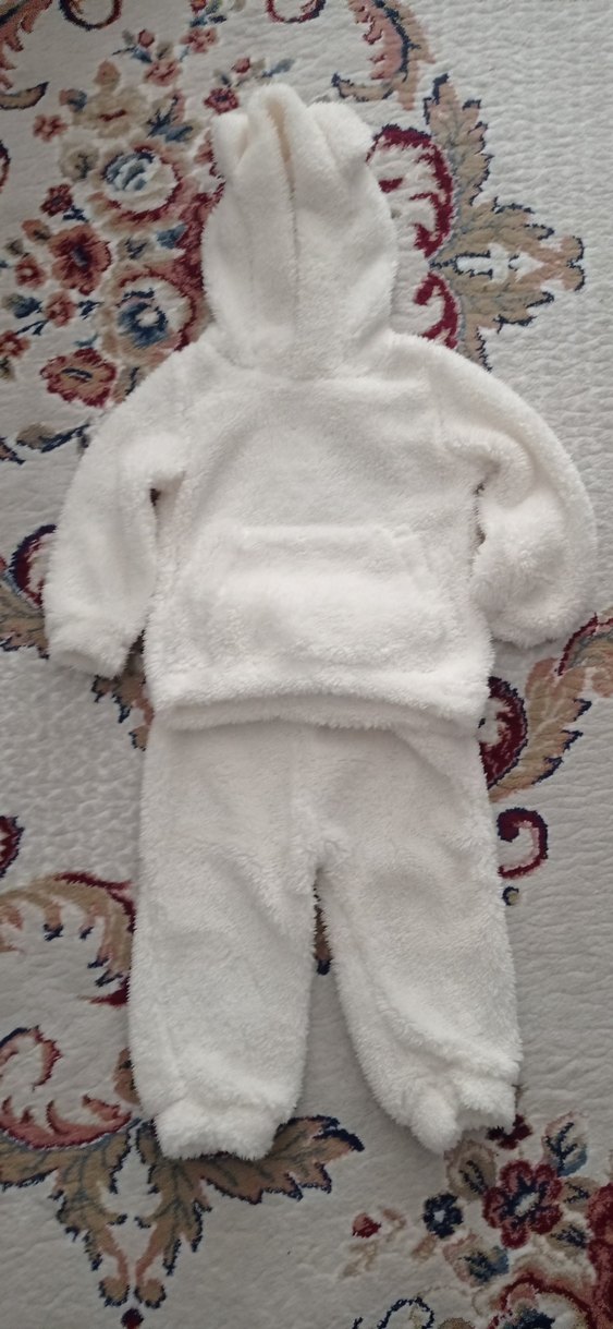 Beyaz renkte, kapüşonlu ve kürklü detaylı, yumuşak dokulu bebek takımı ❄️