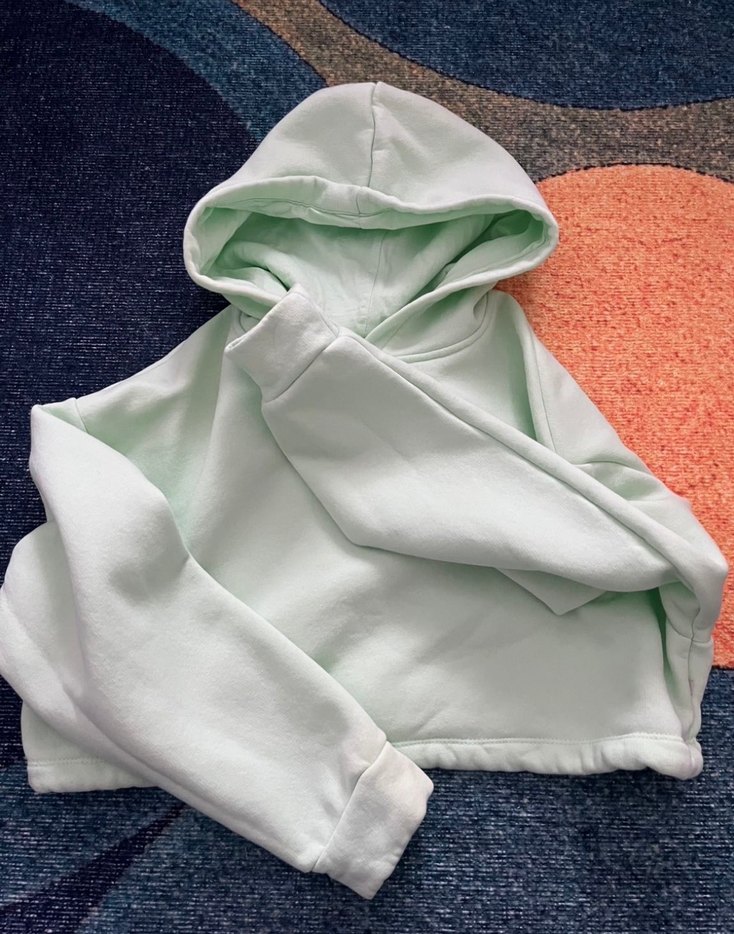 Pastel beyaz renkte, kapüşonlu ve uzun kollu kadın sweatshirtü. Yumuşak ve sıcak kumaştan, bol kesim ve kısa boyda, rahat ve şık bir sokak stili için uygundur.