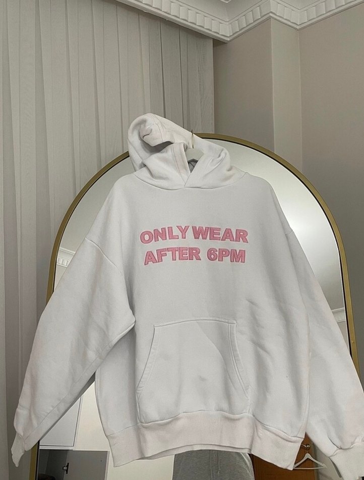 Yumuşak fleece kumaştan, uzun kollu, bol kesim beyaz kapüşonlu sweatshirt. Önünde pastel renkli "ONLY WEAR AFTER 6PM" baskısı bulunur. Spor ve rahat stil için uygun. ♀️