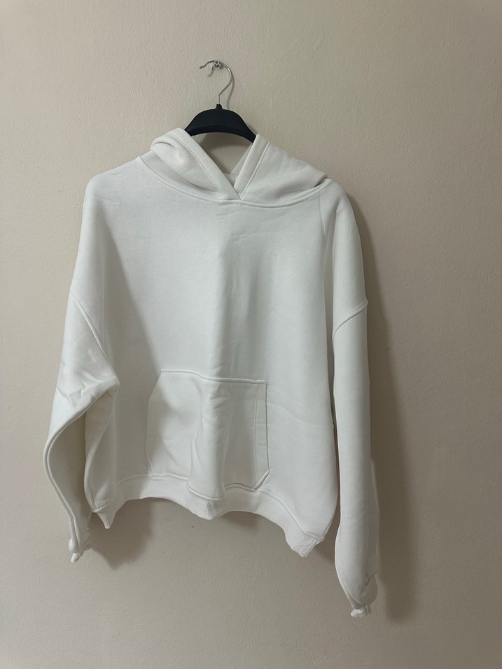 Beyaz kapüşonlu sweatshirt, rahat oversize kesim ve uzun kollu. Yumuşak ve sıcak kumaştan yapılmış, günlük kullanım için sade ve minimal tarz sunar.