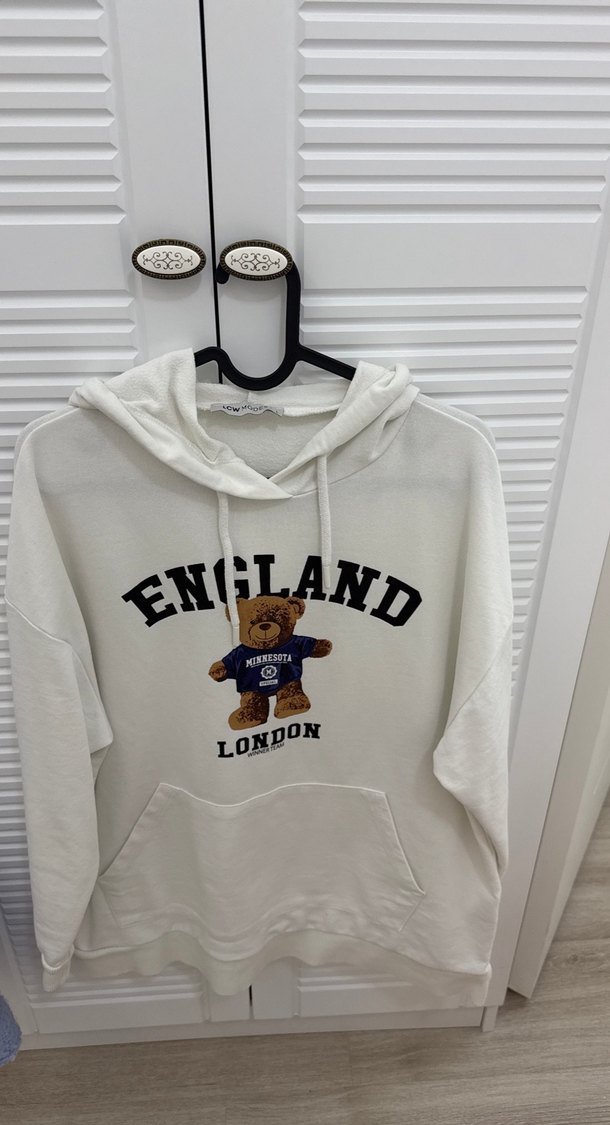 Beyaz, örme kumaşlı sweatshirt, baskılı ayıcık ve 'ENGLAND' ile 'LONDON' yazılarıyla dikkat çekiyor. Yuvarlak yaka, uzun kollu ve bol kesimdir.