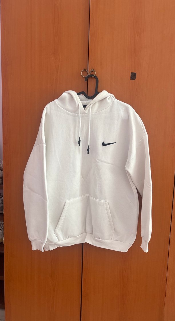 Yumuşak kumaştan, rahat kesim beyaz kapüşonlu uzun kollu sweatshirt. Nike logosu ile sade athleisure tarz.