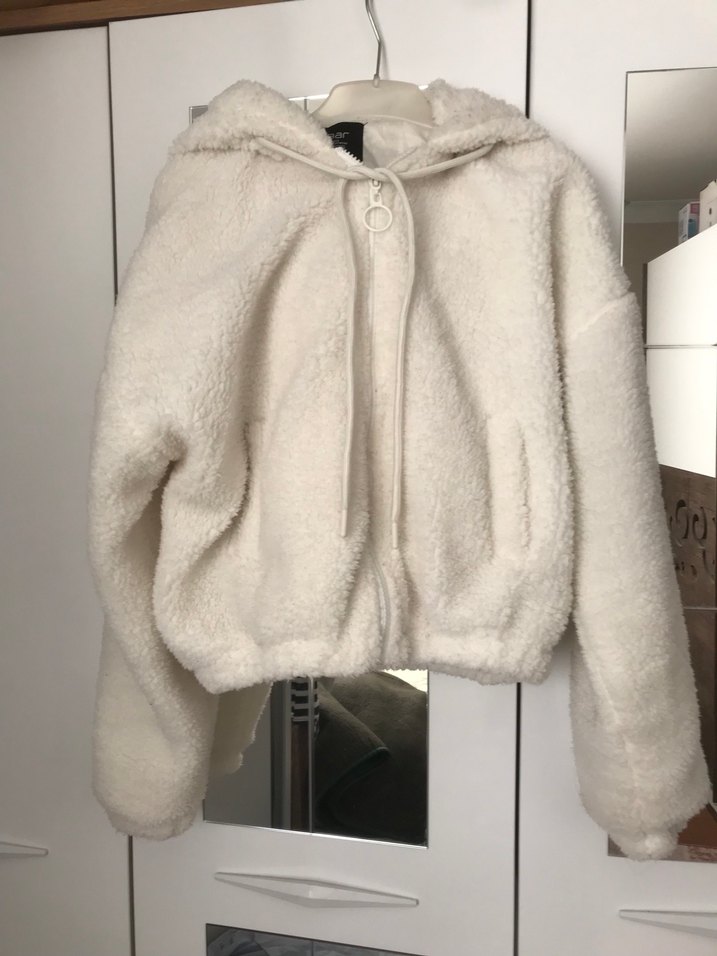 Bu beyaz peluş ceket kapüşonlu ve kürklü detaylara sahip, bol kesim ve midi boyda rahat bir tarz sunar. Sokak modası ve günlük kullanım için uygundur. ❄️