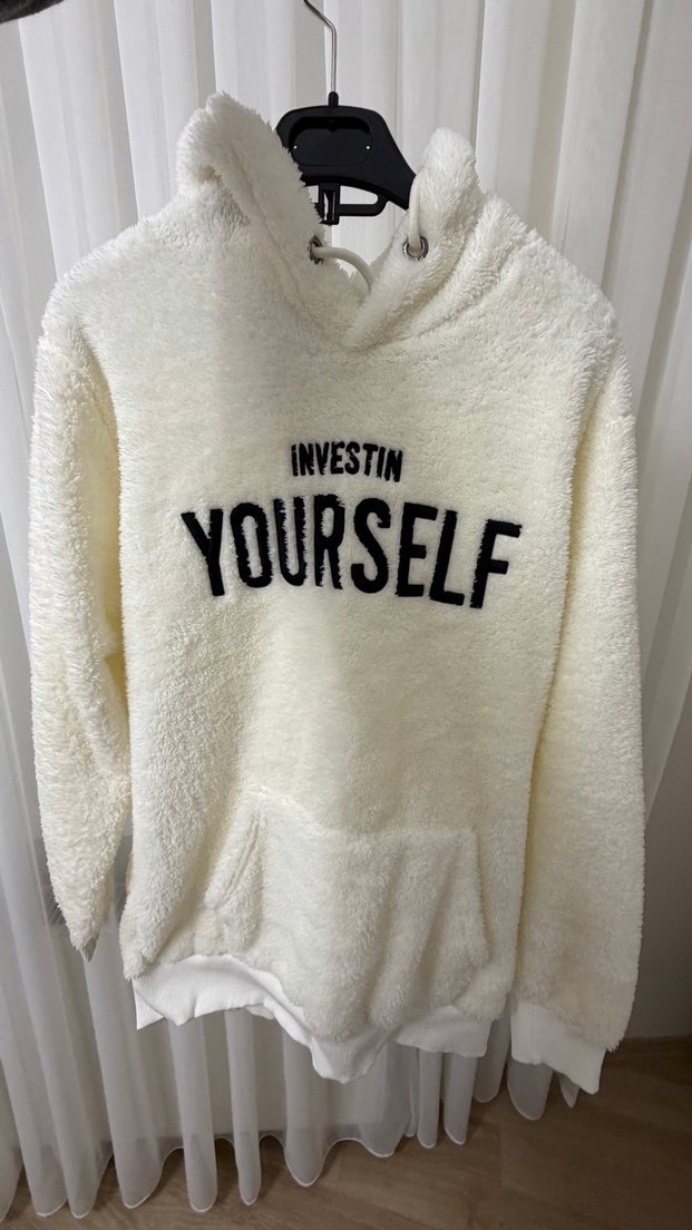 Beyaz renkli, kapüşonlu ve uzun kollu kadın sweatshirtü, yumuşak peluş kumaştan üretilmiştir. Önünde "INVESTIN YOURSELF" yazılı baskı vardır. Rahat ve günlük kullanıma uygundur.