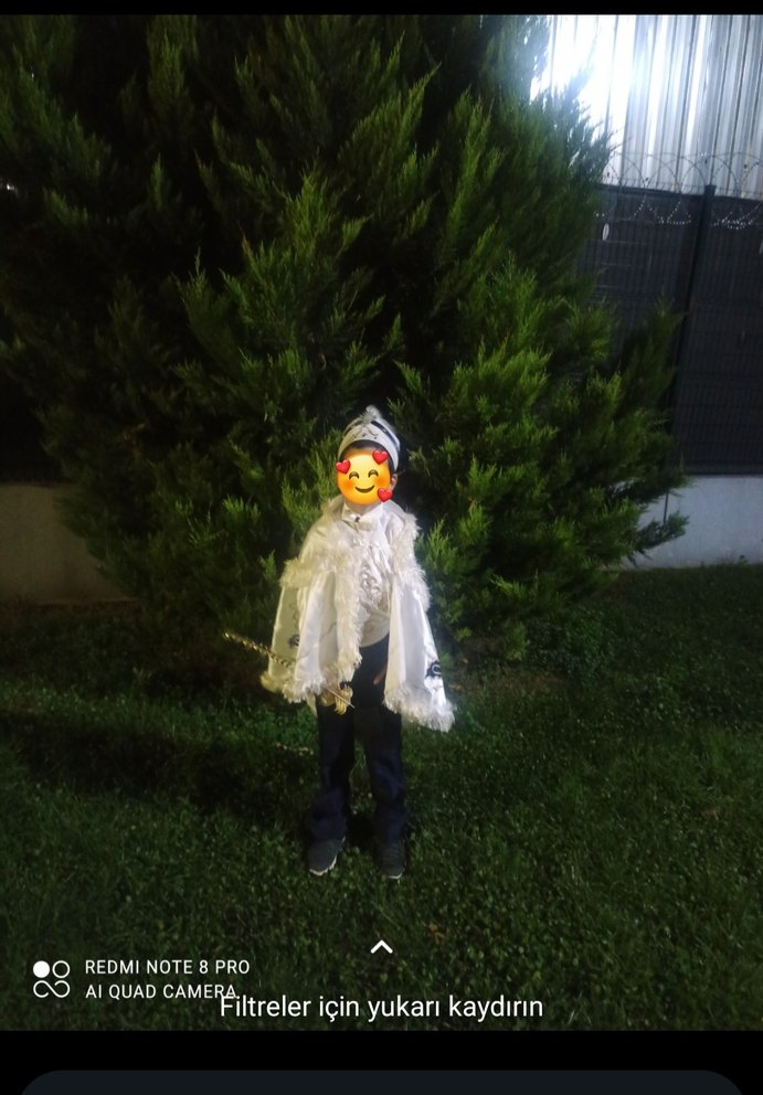 sünnet kıyafeti şapkası gömleği papyonu pantolonu kemeri maşallah yazısı asasi ve pancosu kısaca tüm parçaları vardır sadece bir kez giyildi tertemizdir