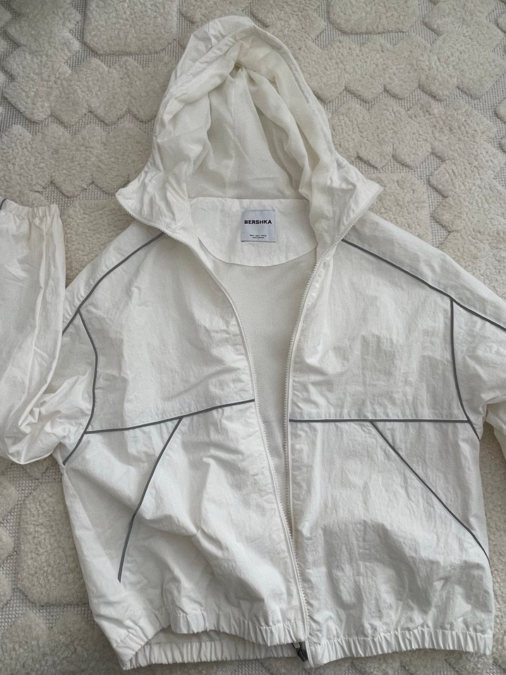 Hafif keten kumaştan, kapüşonlu ve fermuarlı, gri şerit detaylı beyaz rahat kesim ceket. Günlük kullanıma uygundur.