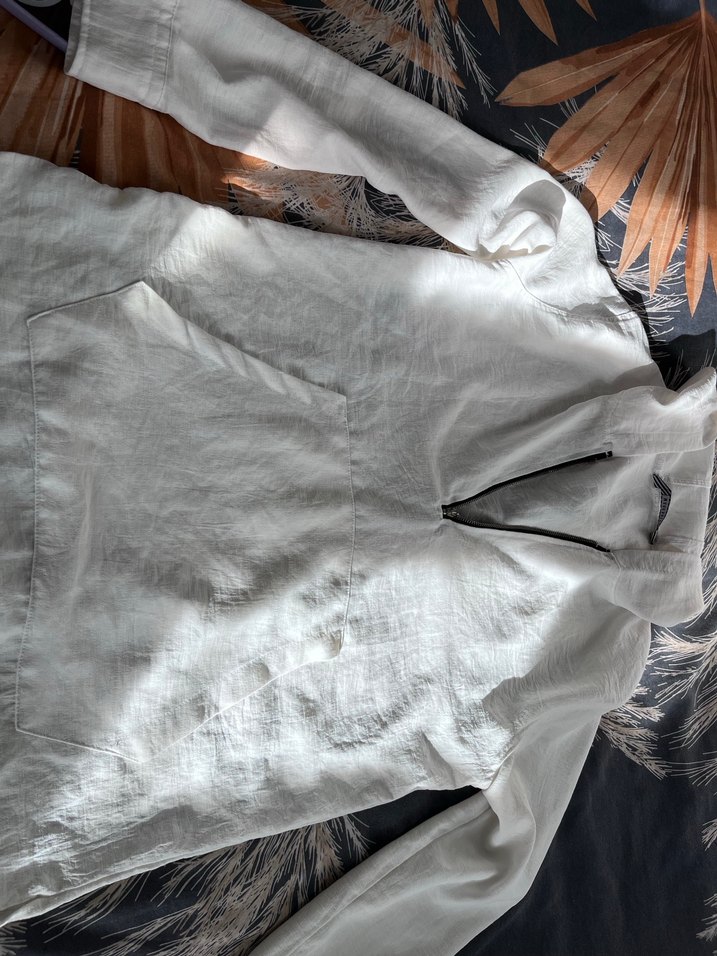 Beyaz renkte, kapüşonlu ve fermuarlı . Keten kumaştan, uzun kollu ve rahat kesim midi boyda, sokak stiline uygun.