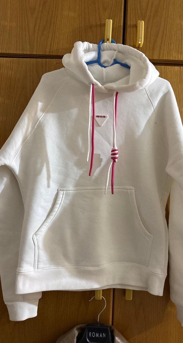 Beyaz, rahat kesim ve normal boyda sweatshirt, bisiklet yaka ve ön cep detayına sahip. Yumuşak kumaştan üretilmiş, günlük kullanıma uygun. Pembe ip detayları ile renklendirilmiş. İçi sıcacık