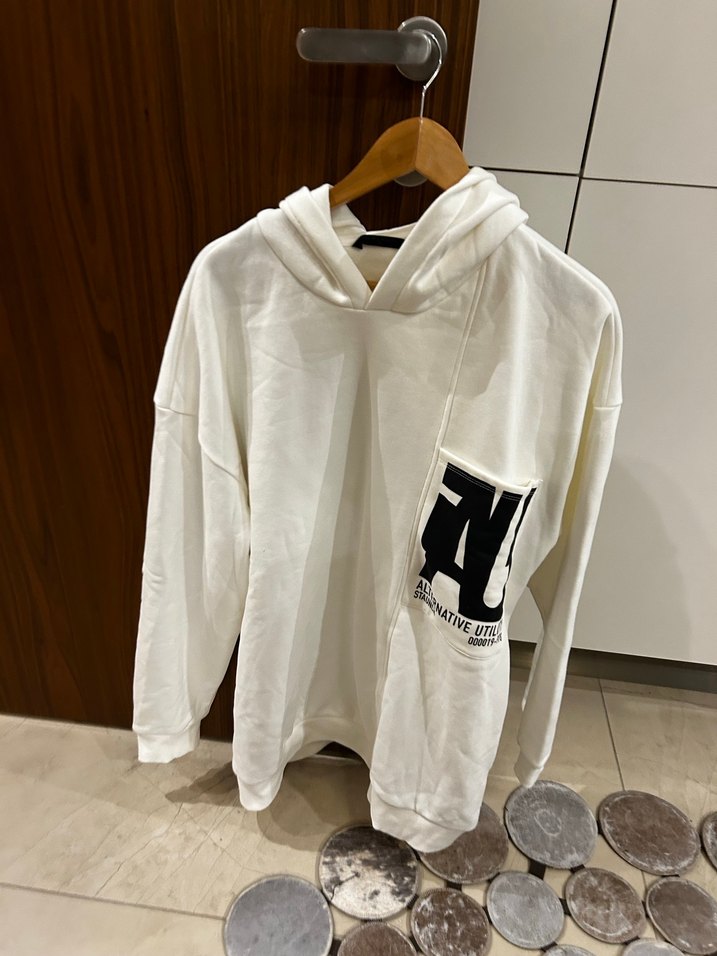 Uzun kollu, beyaz, bol kesim sweatshirt. Önünde gri baskı deseni bulunur ve yumuşak fleece kumaştan üretilmiştir. Günlük kullanım için uygundur.