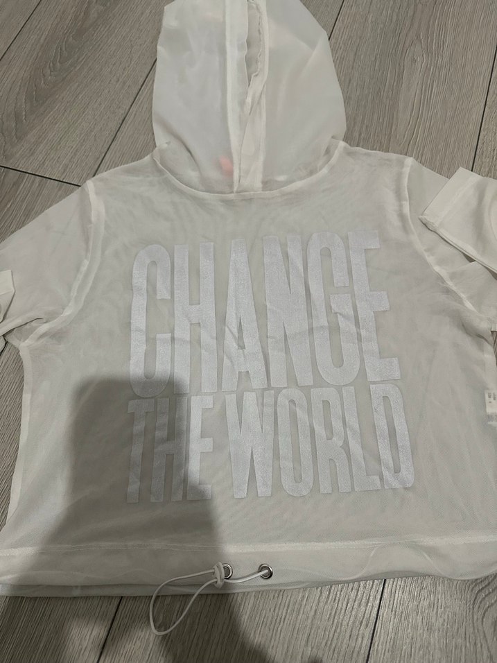 Beyaz kapüşonlu, uzun kollu transparan ve bol kesim şeffaf sentetik kumaştan sweatshirt. "CHANGE THE WORLD" baskılı ve ayarlanabilir bağcıklı etek ucu bulunur.