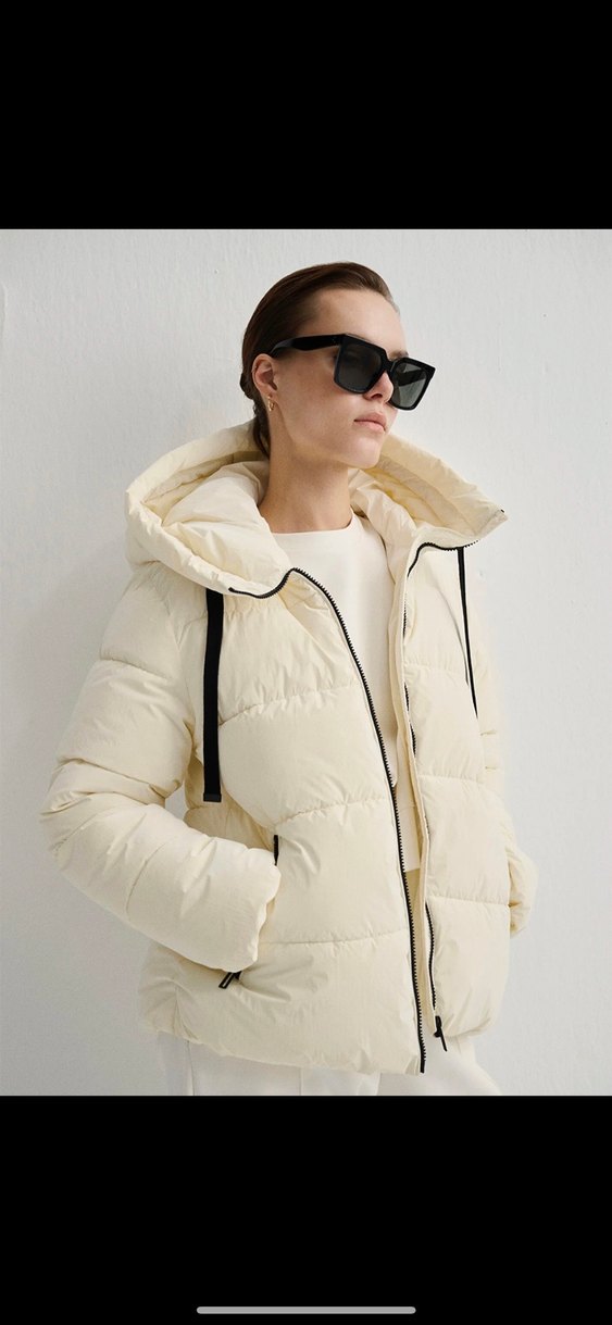 Yüksek yakalı, kapüşonlu beyaz şişme mont. Uzun kollu ve normal kesim, yumuşak ve sıcak kumaştan midi boyda rahat bir tasarım sunar. Ürün çok az kullanıldı geçen kış alındı