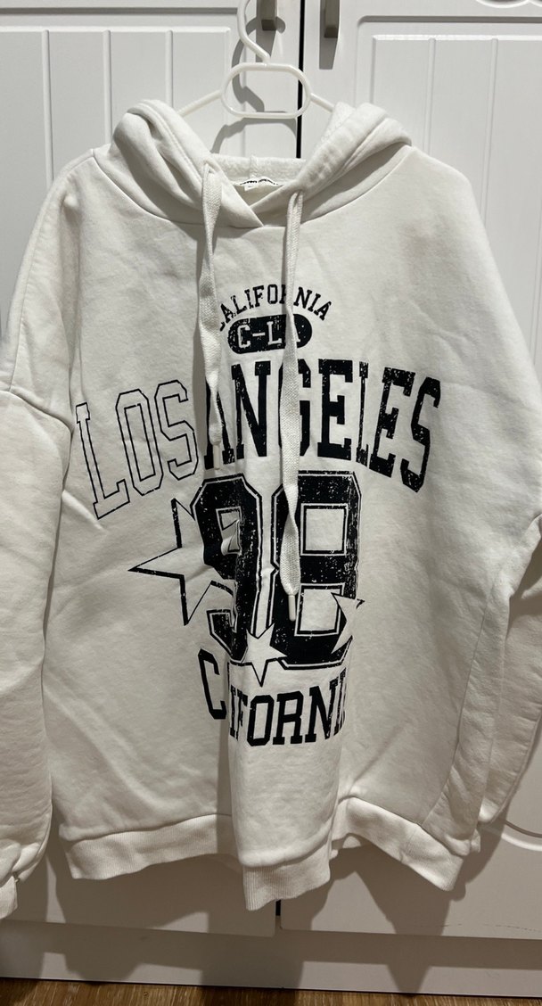 Pamuklu, uzun kollu, bol kesim beyaz kapüşonlu sweatshirt. Önü "Los Angeles 98" baskılı ve zincir detaylıdır. Sokak stiline uygun.