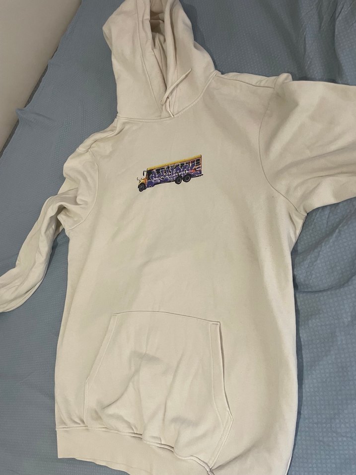 Beyaz renkli, uzun kollu, bol kesim sweatshirt. Önünde baskılı desen ve kanguru cepli, rahat ve sıcak kumaştan üretilmiştir. Unisex bir model bol kesim M bedendir.H&M den geçen sene alındı.1-2 sefer kullanılmıştır