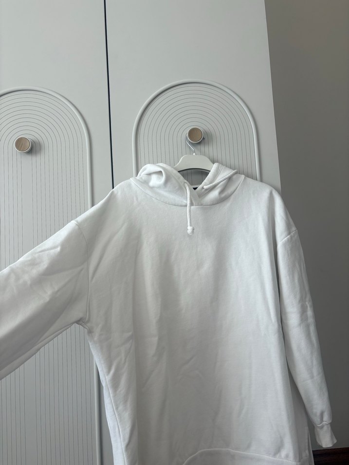 Beyaz, kapüşonlu, uzun kollu ve salaş kesimli sweatshirt, yumuşak ve sıcak dokusuyla gündelik sokak stiline uygun.