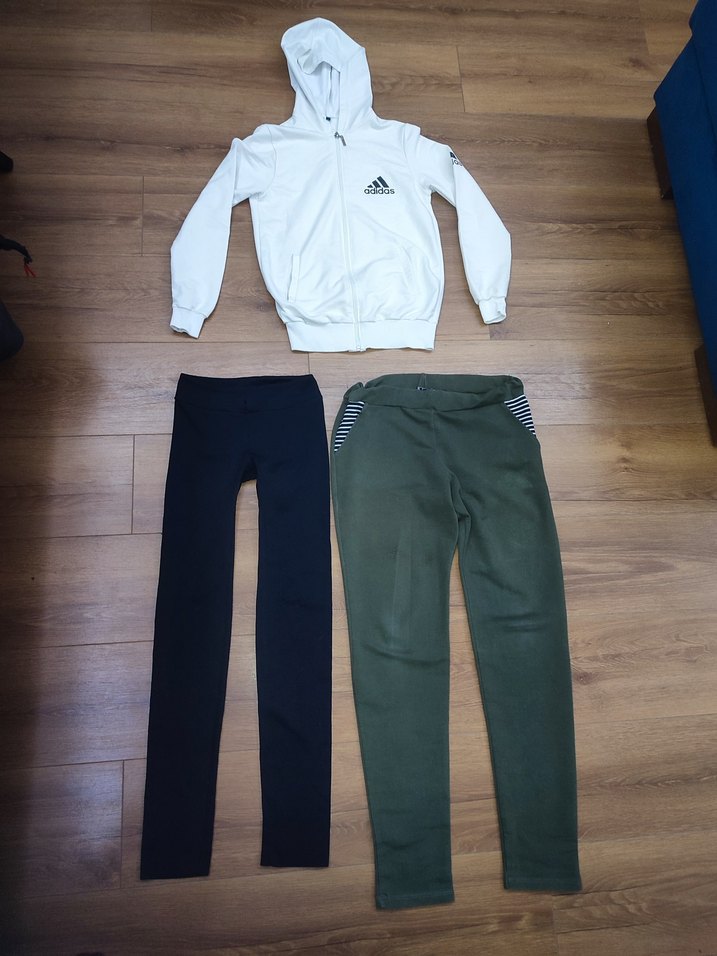 ölçüleri resimlerde görüldüğü gibi s ve M beden Siyah tayt s beden uyumlu son resimde kırmızı kalemle işaretlediğim yerde ufak bi sökük var. Beyaz kapüşonlu, uzun kollu, fitted kesim sweatshirt ve koyu renklerle gri tonlarında iki pantolon içeren kız çocukları için rahat hepsi 3 parça gönderilecektir