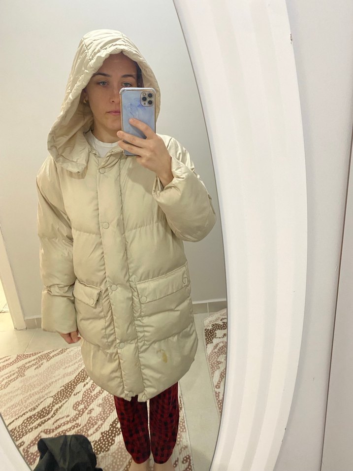 Yumuşak ve sıcak kumaştan, kapüşonlu, uzun kollu, yüksek yakalı beyaz puff mont. Salaş kesimi ve midi boyuyla rahat kullanım sağlar.