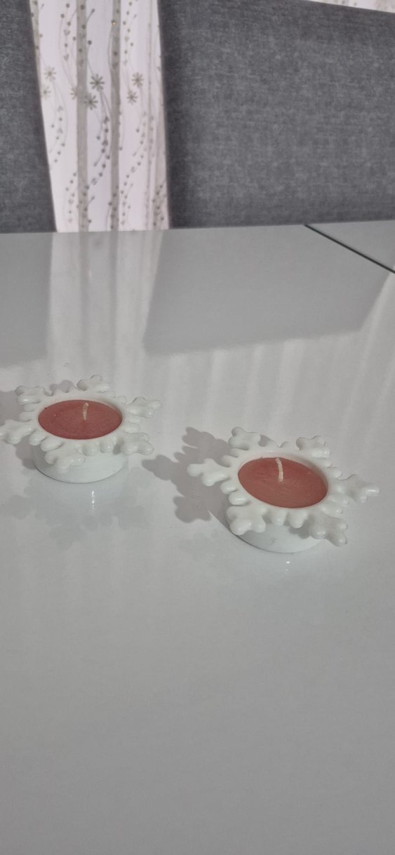 İki beyaz kar tanesi şeklinde mumluk ve açık renk mumlar içeren set, ortama sıcaklık katar. ❄️