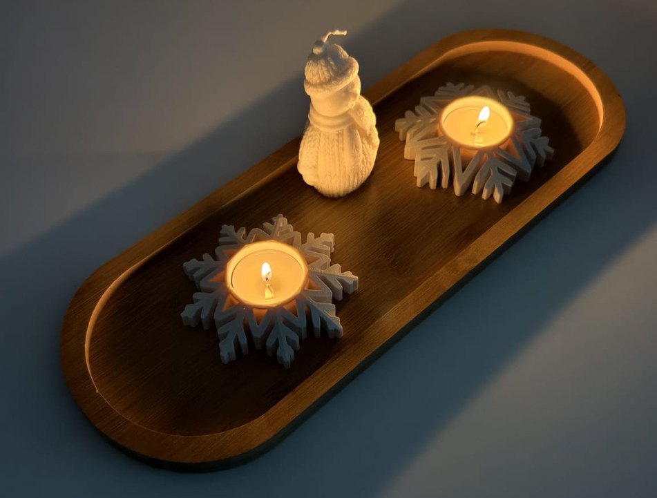 Ahşap tepsi üzerinde beyaz kar tanesi şeklinde mumluklar. 3d Print Design Dekoratif Hediyelikler. İstenilen sayıda ilan açılır. İkili fiyatıdır. #evyaşam#ev#hediyelikler#mumluk#hobi#evdekorasyonu#mum