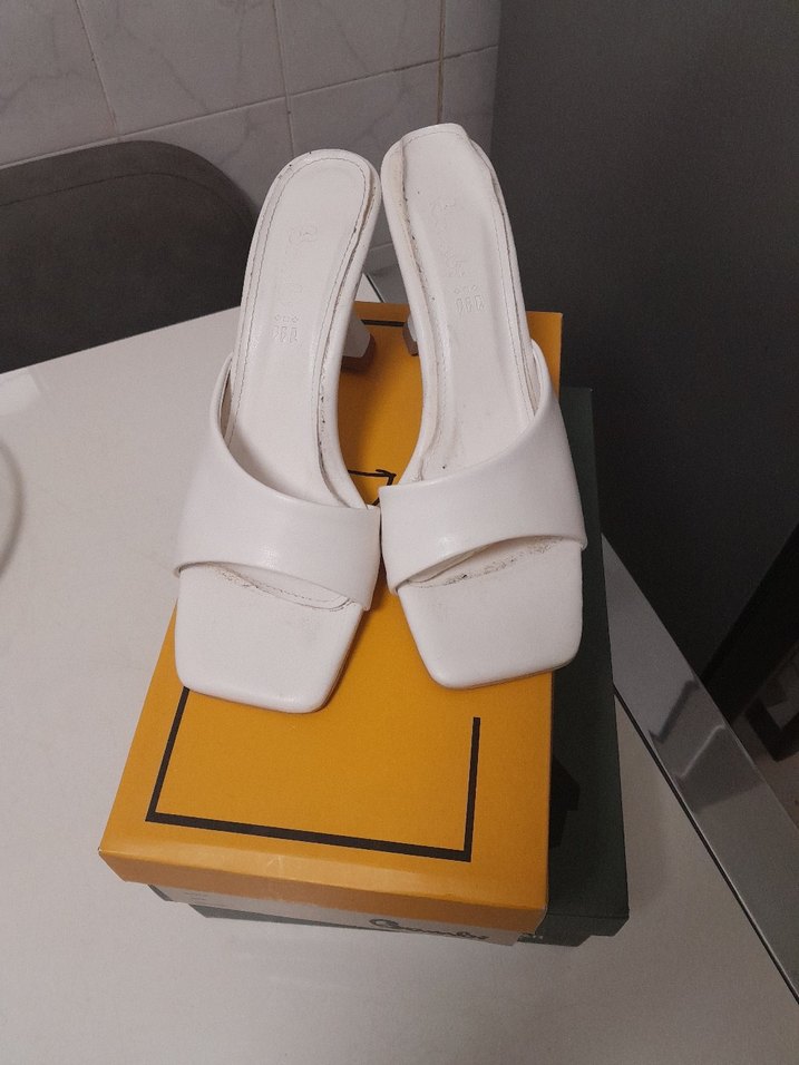 Beyaz kare burunlu topuklu sandalet, tokalı ve baskılı minimalist tasarıma sahip, günlük sokak modasına uygun.kadeh topuk resimde gördüğünüz gibi kenarları dolapta durmaktan açılmış kullanıma engel değil #