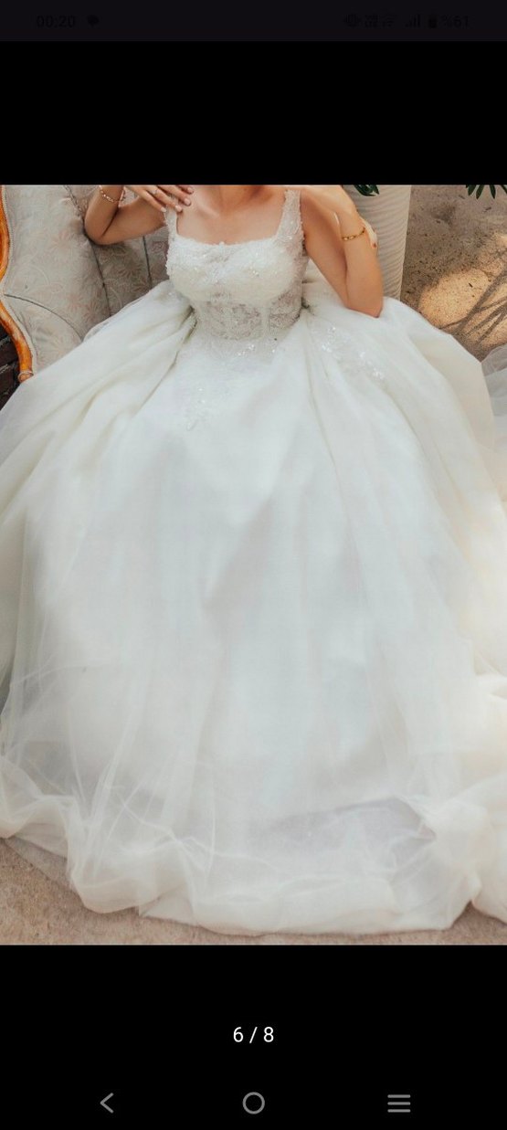 Beyaz renkte, kare yaka ve kalin askılı, uzun boy A kesim gelinlik. Modern ve şık tarzda, vücuda oturan kesimiyle gösterişli bir duruş sunar. s ve xs bedenler tercih edebilir .duvak ve tarlatan hediyemdir.ben 150 boy 49 kiloda giymiştim .