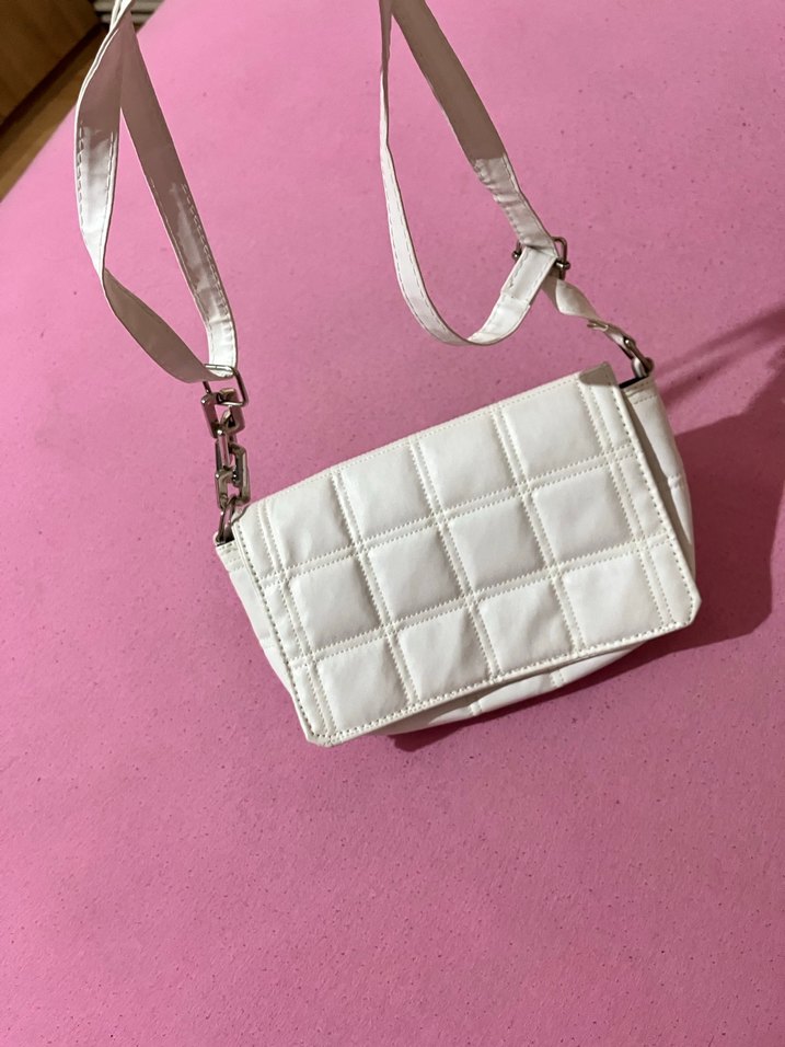 Beyaz deri çanta, kareli desene ve tokalı askıya sahiptir, günlük şık sokak tarzı için uygundur.