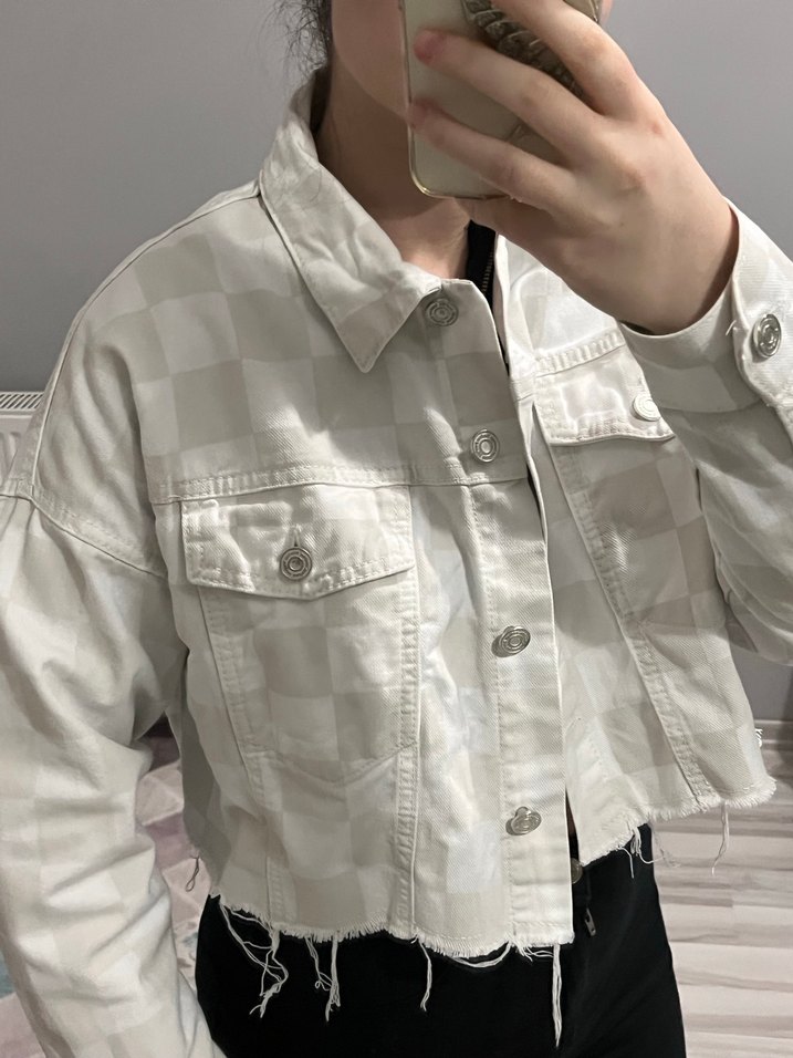 Beyaz Kareli Düğmeli Kadın Kot Ceket