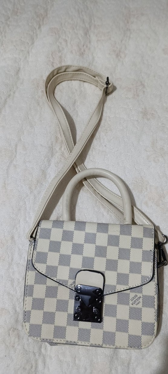 Beyaz kareli desenli kadın çanta, tokalı kapamayla dikkat çeker. Sentetik kumaştan üretilmiş olup, çıkarılabilir askıya sahiptir.