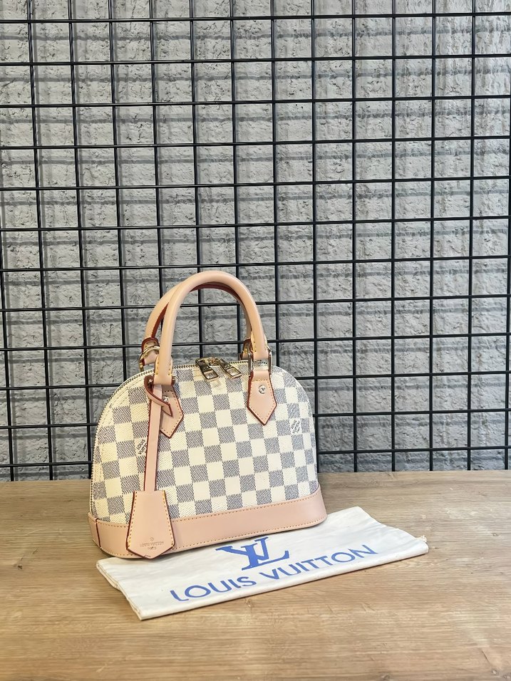 Louis Vuitton kadın çanta, pastel beyaz kareli desen, deri malzeme ve tokalı detaylarla modern klasik Paris tarzını yansıtıyor.